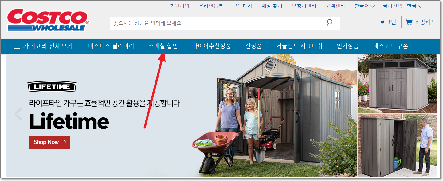 코스트코는 우리나라 전 지역에 총 16개의 매장을 가지고 있는데요 온라인에서 스페셜 할인을 확인해 볼 수 있습니다. 그래서 코스트코에서 할인하는 품목을 미리 온라인으로 확인하고 가시면 좀 더 규모 있는 소비를 할 수 있습니다. 잠시 할인 품목을 미리 확인할 수 있는 방법을 알아보겠습니다. 코스트코 온라인 홈페이지에 들어가서 아래처럼 "스페셜 할인"을 누릅니다.