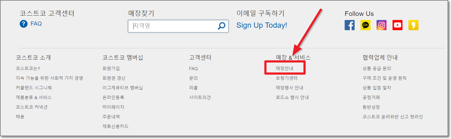 자 그러면 이번에는 코스트코 휴무일에 대해서 알아보겠습니다. 코스트코 홈페이지 맨 아래에서 "매장안내"를 누릅니다.