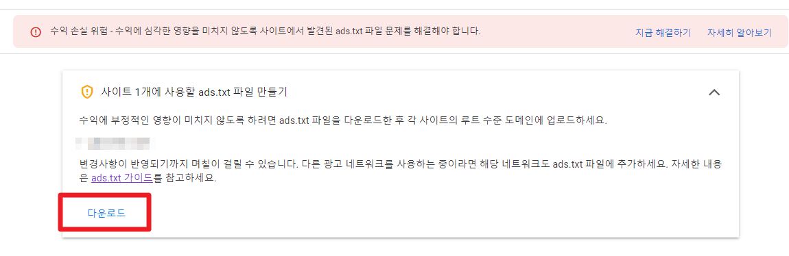 수익 손실 위험 - 수익에 심각한 영향을 미치지 않도록 사이트에서 발견된 ads.txt 파일 문제를 해결해야 합니다.