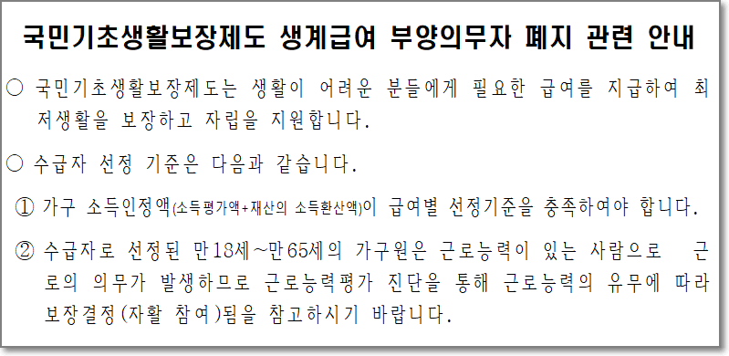 여기까지 말씀드리면 기존에 기초생활 수급자에 대해서 살펴보시고 공부해보셨던 분이라면 "그럼 부양의무자는?"이라고 하실텐데요. 부양의무자 조건은 2022년도에 완전폐지될 예정이며 2021년에는 노인, 한부모 수급권자 대상으로 생계급여에서만 부양의무자 기준이 폐지되었습니다.