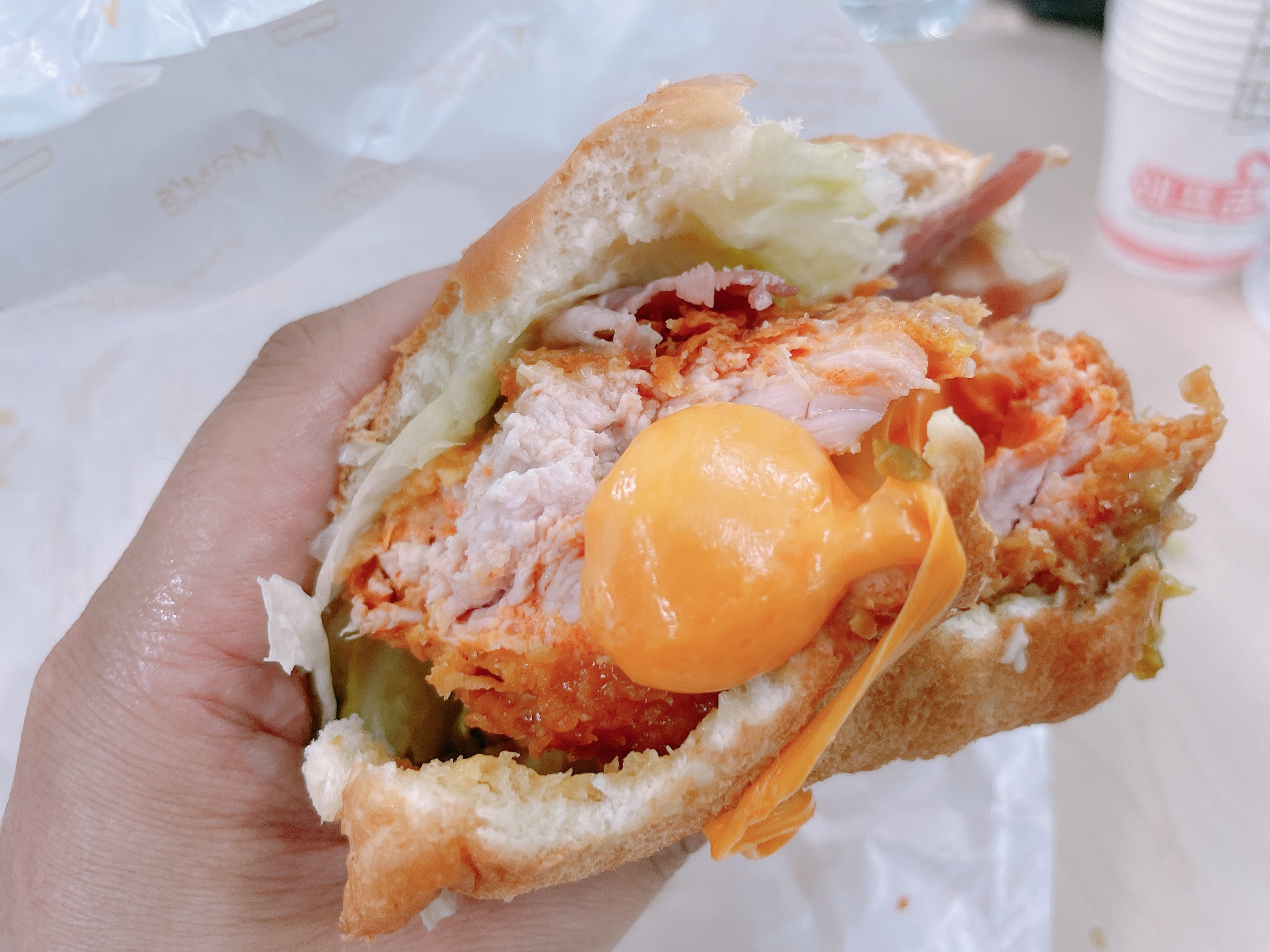 하지만 한입 두입 베어 물기 시작하자 닭가슴살 패티 중앙에서 치즈가 흘러나옵니다. 오웃 지쟈쓰!!