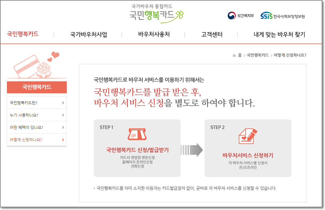 각 카드사 온라인 사이트와 전화, 영업점 방문을 통해 신청이 가능하며, 카드를 신청 후 발급을 받은 후에는 바우처 서비스를 신청해야 합니다.
