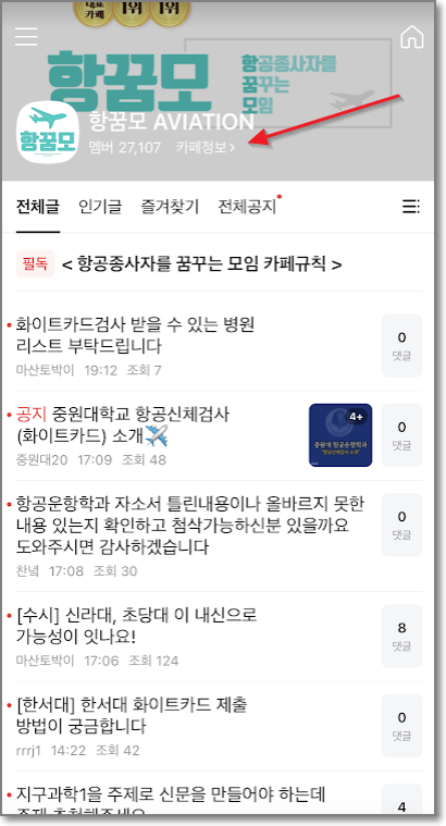 첫째, 네이버 카페앱을 실행하고 카페를 들어갑니다. 어쩌다 보니 항꿈모 카페를 열어서 캡처했는데요. (항꿈모 운영진님, 진짜로 탈퇴는 하지 않겠습니다.) 이상태에서 화살표가 가리키는 카페 이름 아래 "카페 정보"를 누릅니다.