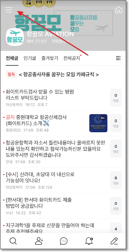 일단 다시 카페 홈으로 와서 상단에 있는 햄버거버튼을 누릅니다.(줄 세 개 버튼-메뉴)