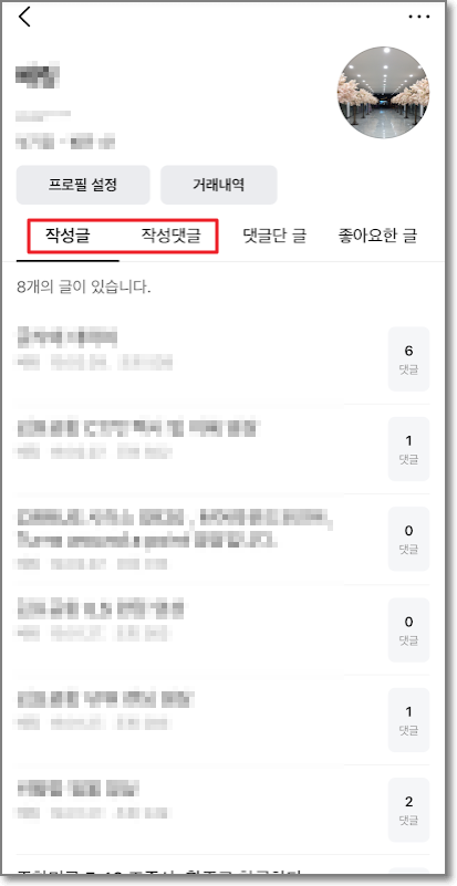 그러면 "작성글"과 "작성 댓글"을 볼 수 있는데요. 하나하나 눌러서 지우고자 하면 삭제를 하면 됩니다.