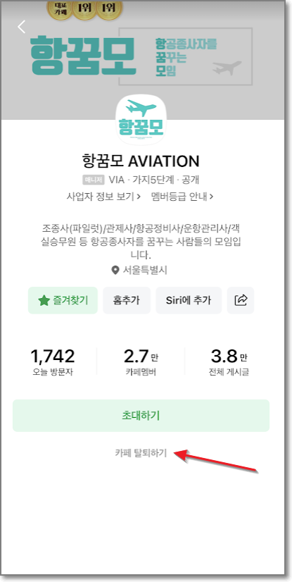 이제 떠날 준비가 되었으면 다시 "카페 정보"를 누르고 "탈퇴하기"를 누르면 이 카페에서의 모든 인연이 끝나게 됩니다.