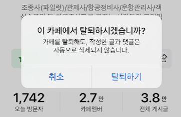 일단은 취소를 누르고 혹시 카페에 쓴 글들이 있는지 조회를 해봐야 합니다. 만약 탈퇴를 하고 나면 그 글은 영원히 지울 수 없으니까요.