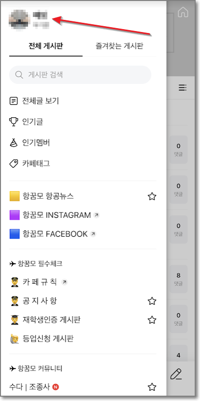 일단 다시 카페 홈으로 와서 상단에 있는 햄버거버튼을 누릅니다.(줄 세 개 버튼-메뉴)
