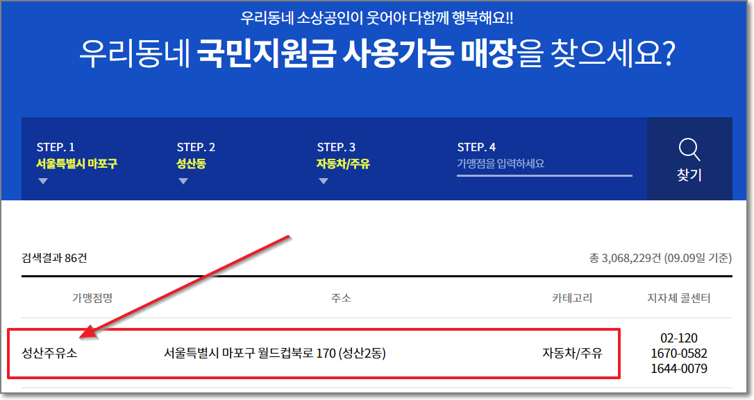 위의 사이트에 들어가면 지역을 선택하고 상세 지역(동)을 선택하고 업종을 선택하거나 실제 가맹점명을 입력하면 사용 여부를 알 수 있는데요. 예를 들어서 서울시 마포구 성산동에서 자동차/주유로 검색을 해보면 성산2동에 있는 "성산주유소"에서 사용 가능한 것을 확인할 수 있습니다.