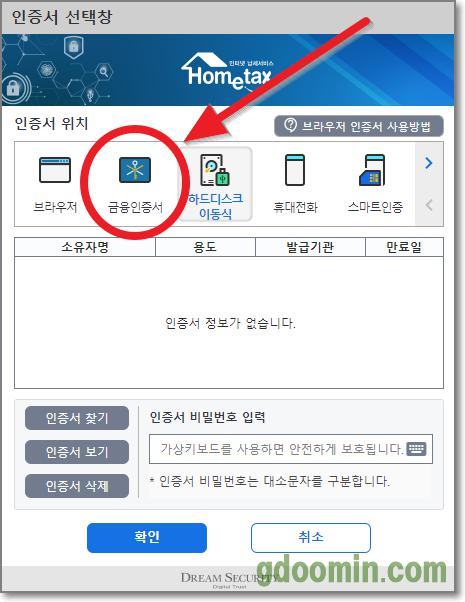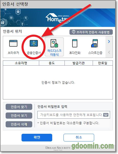 3. "인증서 선택창"에서 "금융인증서" 클릭