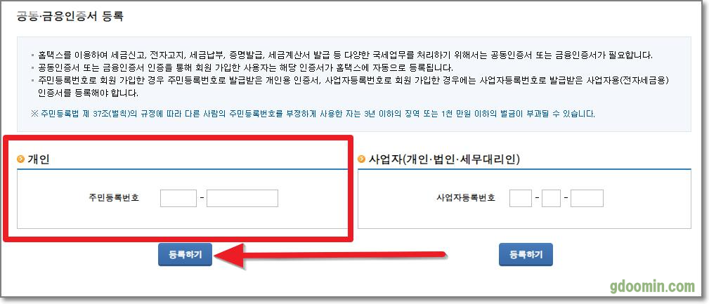3. "공동.금융인증서 등록"에서 "개인" 주민번호 입력 후 "등록하기" 클릭