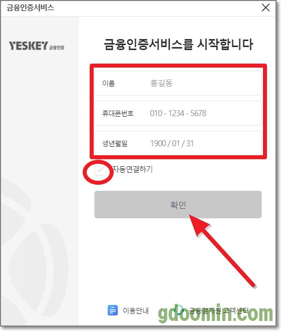 금융인증서비스를 시작합니다.에서 이름과 휴대폰번호(숫자가 잘 입력되지 않으니 주의해서 입력)와 생년월일을 입력하고 하단에 "자동연결하기"에 체크해주고 "확인"을 누릅니다.