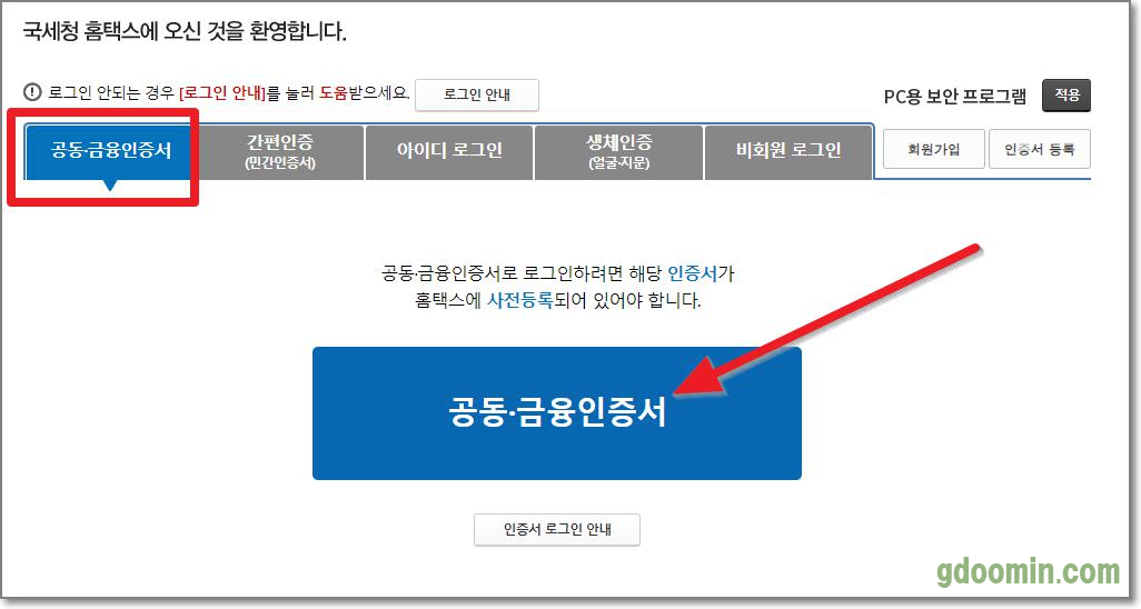 2. 로그인 선택에서 "공동.금융인증서"선택 후 클릭