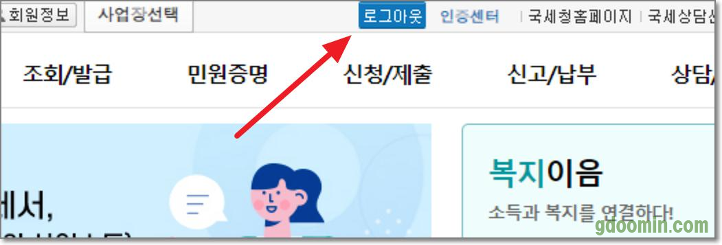 홈택스 홈페이지 상단에 "로그인"이었던 곳이 "로그아웃"으로 변했으면 로그인이 제대로 된 것입니다.