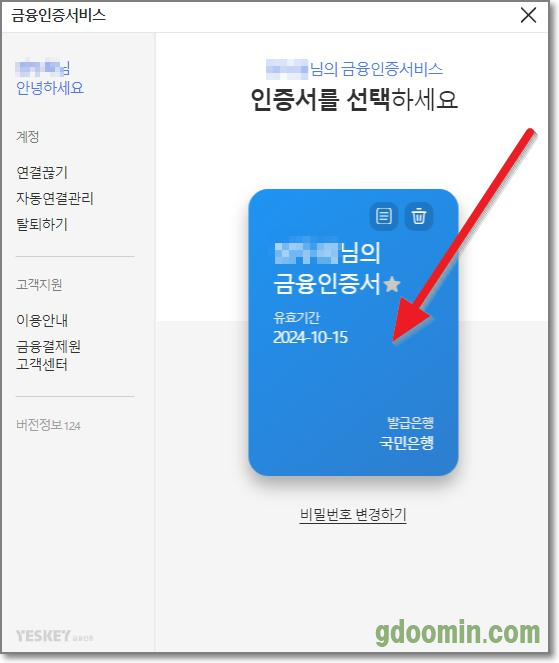 위에서 등록한 금융인증서가 바로 나오게 됩니다. 본인 이름이 쓰여진 "금융인증서"를 클릭합니다.