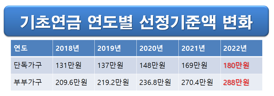 2021년도 기초연금 선정 기준 소득인정액은 단독가구 169만원이, 부부가구 270만4천원이었었는데요. 2022년부터는 기초연금 선정기준 소득인정액이 단독가구는 180만원, 부부가구는 288만원으로 인상되었습니다.