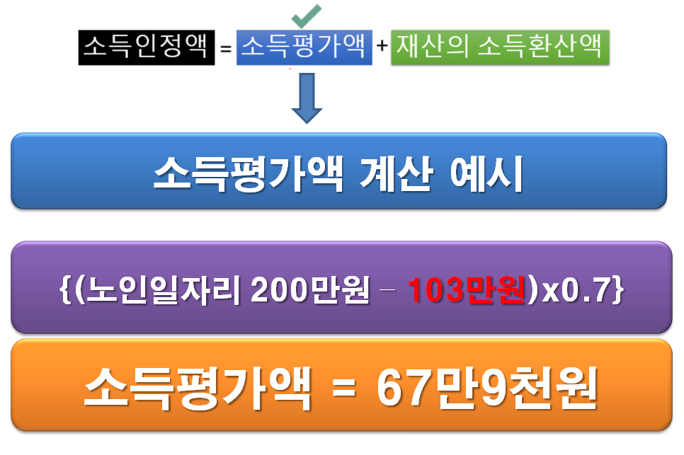 기초연금뿐 아니라 복지제도의 다른 부분에서도 나오는 소득인정액은 소득평가액에 재산의 소득환산액을 더하는건데요. 이중에서 소득평가액의 기본공제금액을 103만원으로 상향시켰기때문에 노인일자리를 통해서 200만원의 소득을 올렸다고 해도 소득평가액은 679,000원이 되는 것입니다. 이전처럼 기본공제액이 96만원이라면 위의 상황에서 소득평가액은 728,000원이 되는 것입니다. 소득인정액에 대한 내용은 아래글을 참고해주시기 바랍니다.
