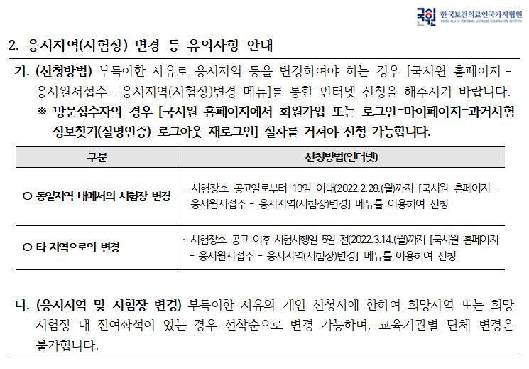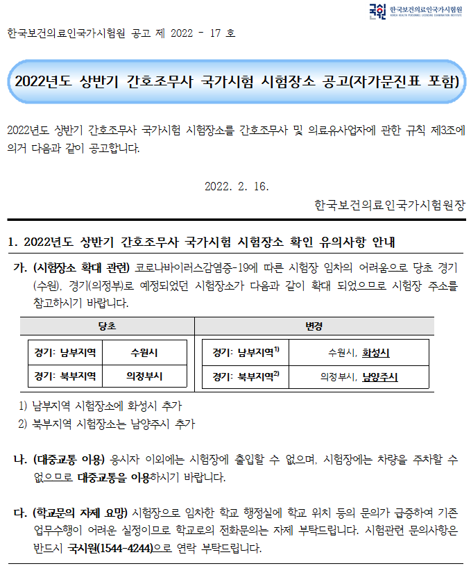 간호조무사는 장기요양기관의 핵심인력이며 간호조무사 자격을 취득하는 방법은 고졸학력 이상과 이론 740시간, 병원 실습 780시간 교육과정을 이수하고 년 2회 있는 간호조무사 국가시험에 자격 시험에 합격을 해야 합니다.2022년도 상반기 간호조무사 시험 응시표 출력이 시작되었으며 시험장소도 발표되었습니다.