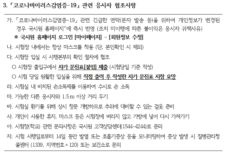 코로나 문진표를 작성해서 제출해야 하는데요. 시험당일 기준으로 작성해서 시험장 출입구에 있는 본부요원에게 반드시 제출해야 합니다. 문진표는 아래에서 다운로드 받으시기 바랍니다.