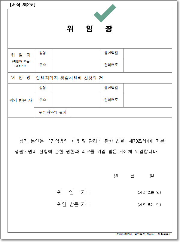 코로나 자가격리 지원금(생활지원비)은 본인이 직접 신청하는 것이 원칙이나 본인이 신청하기 어렵다면 위임장을 작성해서 함께 첨부하면 됩니다.