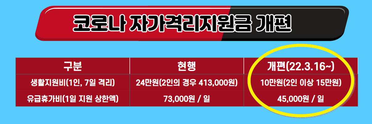 코로나 자가격리 지원금 유급휴가비 및 생활지원비 지원사업 2022년 2월14일 코로나 자가격리 지원금 개편 2022년 2월14일(월) 부터 코로나19 입원·격리자에게 지원하는 생활지원비 및 유급휴가 비