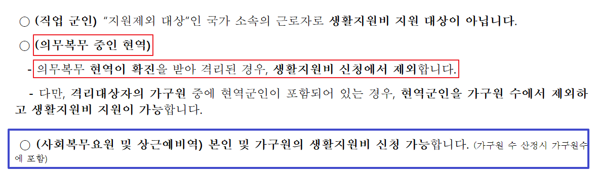 상근예비역과 사회복무요원은 자가격리지원금 대상이며 가구원수에도 포함됩니다.