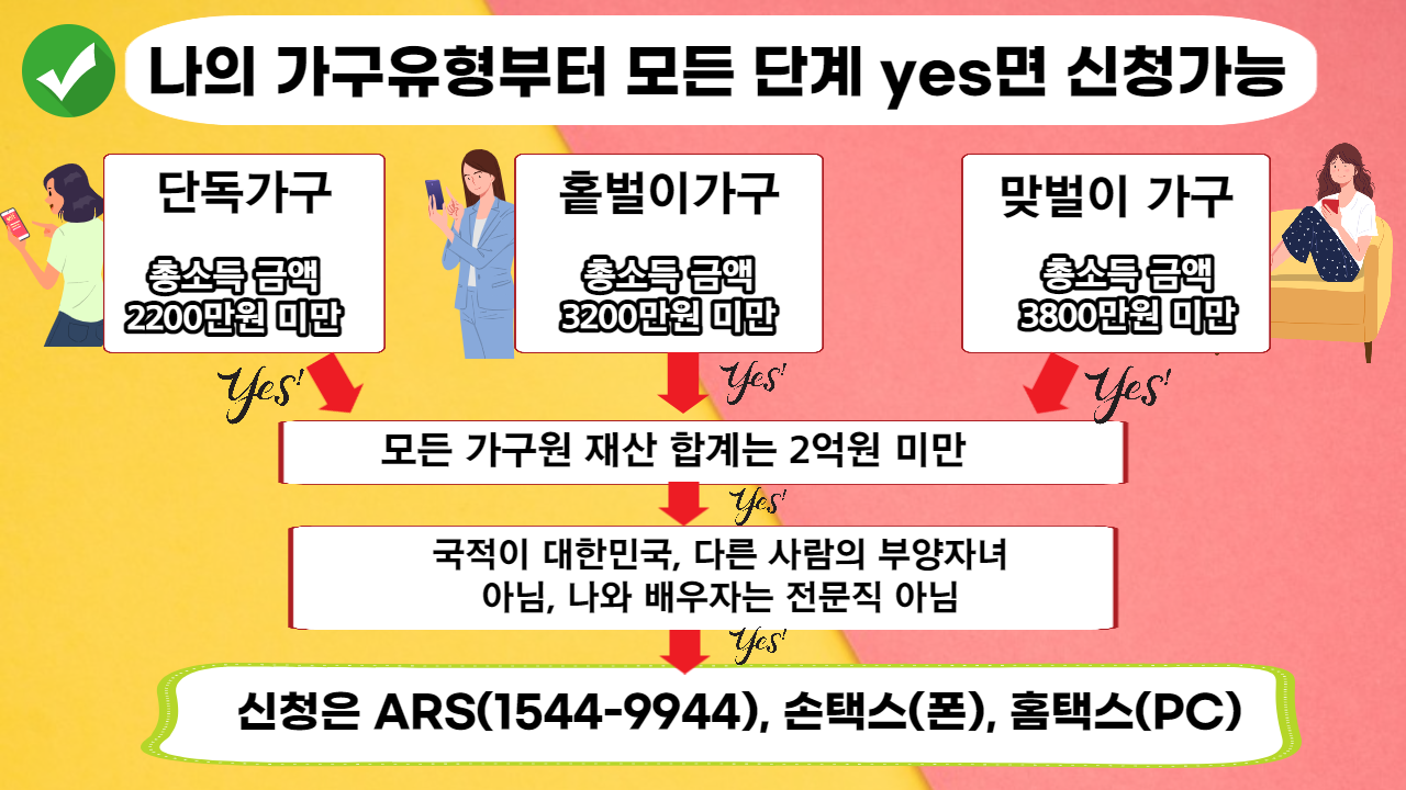 단독가구 400~900만원, 홑벌이가구 700~1400만원, 맞벌이가구 800~1700만원일 때 최대금액 지원