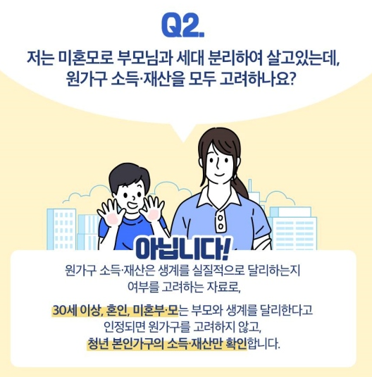 Q2. 저는 미혼모로 부모님과 세대 분리하여 살고 있는데, 원가구 소득·재산을 모두 고려하나요?