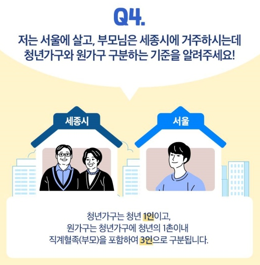 Q4. 저는 서울에 살고, 부모님은 세종시에 거주하시는데 청년 가구와 원가구 구분하는 기준을 알려주세요!