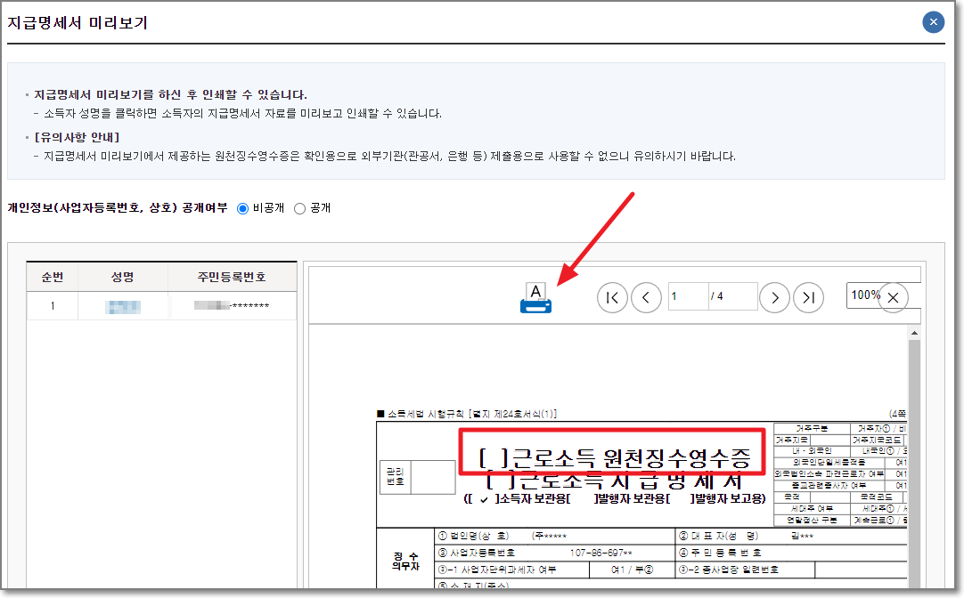 4. 근로소득원청징수영수증 출력하기