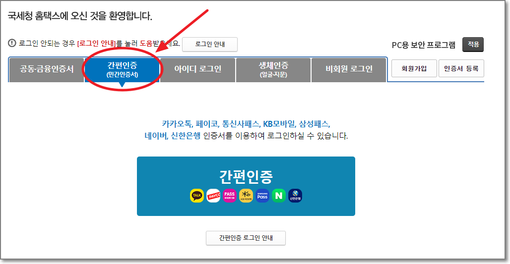 홈택스를 접속해서 로그인을 합니다. 로그인은 공동인증서나 금융인증서로 해도 되며 민간인증서(카카오톡, 네이버 등)를 이용한 간편인증을 해도 됩니다.