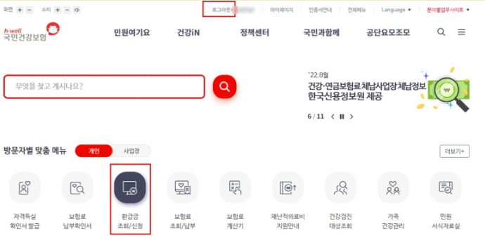 이후에 해당 홈페이지에서 밑에 있는 방문자별 맞춤 메뉴에서 빨갛게 테두리 해놓은 "환급금 조회/신청"을 누르시면 됩니다.