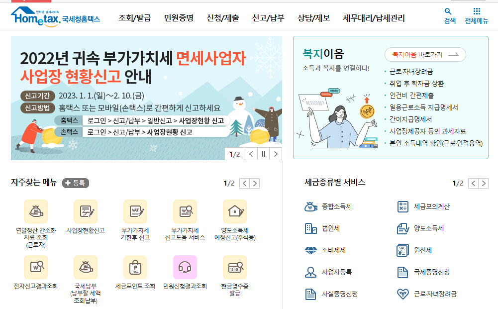 사업자의 과세유형과 등록 상태를 조회하고 싶다면 국세청 홈택스를 이용하면 됩니다. 홈택스의 사업자 등록 번호 조회를 하려면 반드시 사업자등록번호나 주민번호를 알고 있어야 합니다. 정보 입력 후 검색을 하면 과세유형(간이/일반) 및 사업자 상태(계속/휴업/폐업)를 확인할 수 있습니다.