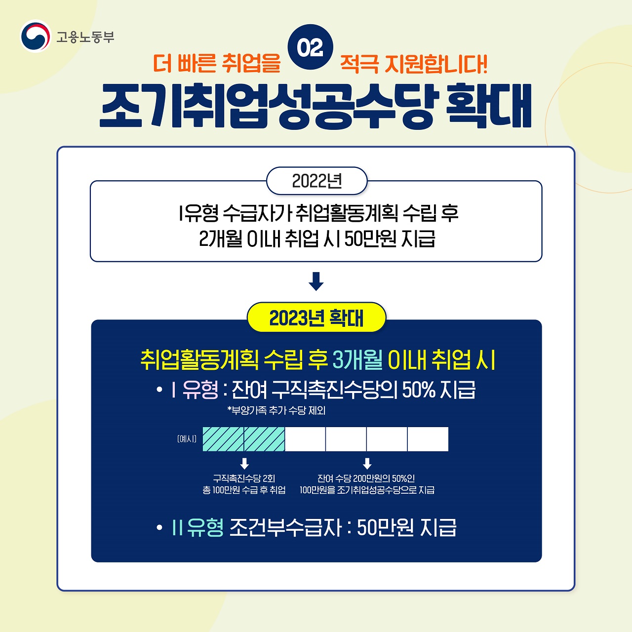 2022년까지는 1유형 수급자가 취업활동계획 수립 후 2개월 이내 취업 시 50만원 지급하던 것을 2023년부터는 취업활동계획 수립 후 3개월 이내 취업 시 1유형은 잔여 구직촉진수당의 50%를 지급하고 2유형 조건부수급자는 50만원을 지급하기로 하였습니다.