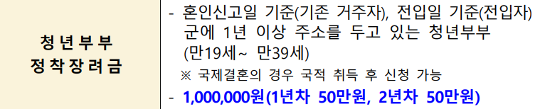 청년부부 정착장려금(연 50만원)과 신혼부부 주택자금 대출이자(최대 500만원)를 지원하고,
