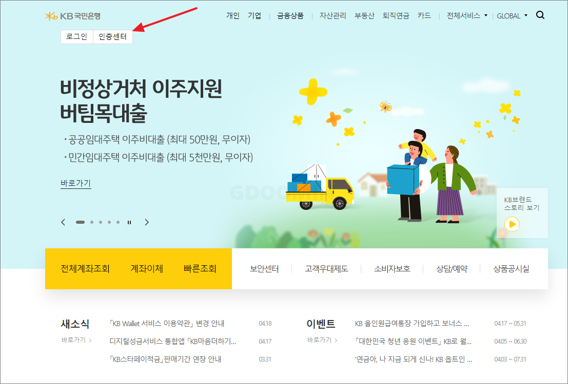 kb스타뱅킹 홈페이지에서 왼쪽 상단에 있는 '인증센터'(개인)를 누릅니다.