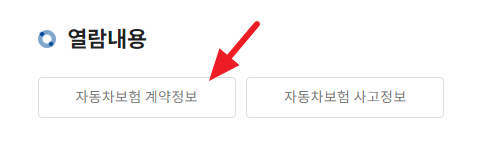보험정보 열람 페이지에서 주민등록번호와 본인인증하는 방법을 선택 후 로그인 하시면 아래와 같이 '자동차보험 계약정보'와 '자동차보험 사고정보'를 열람할 수 있게 나옵니다.