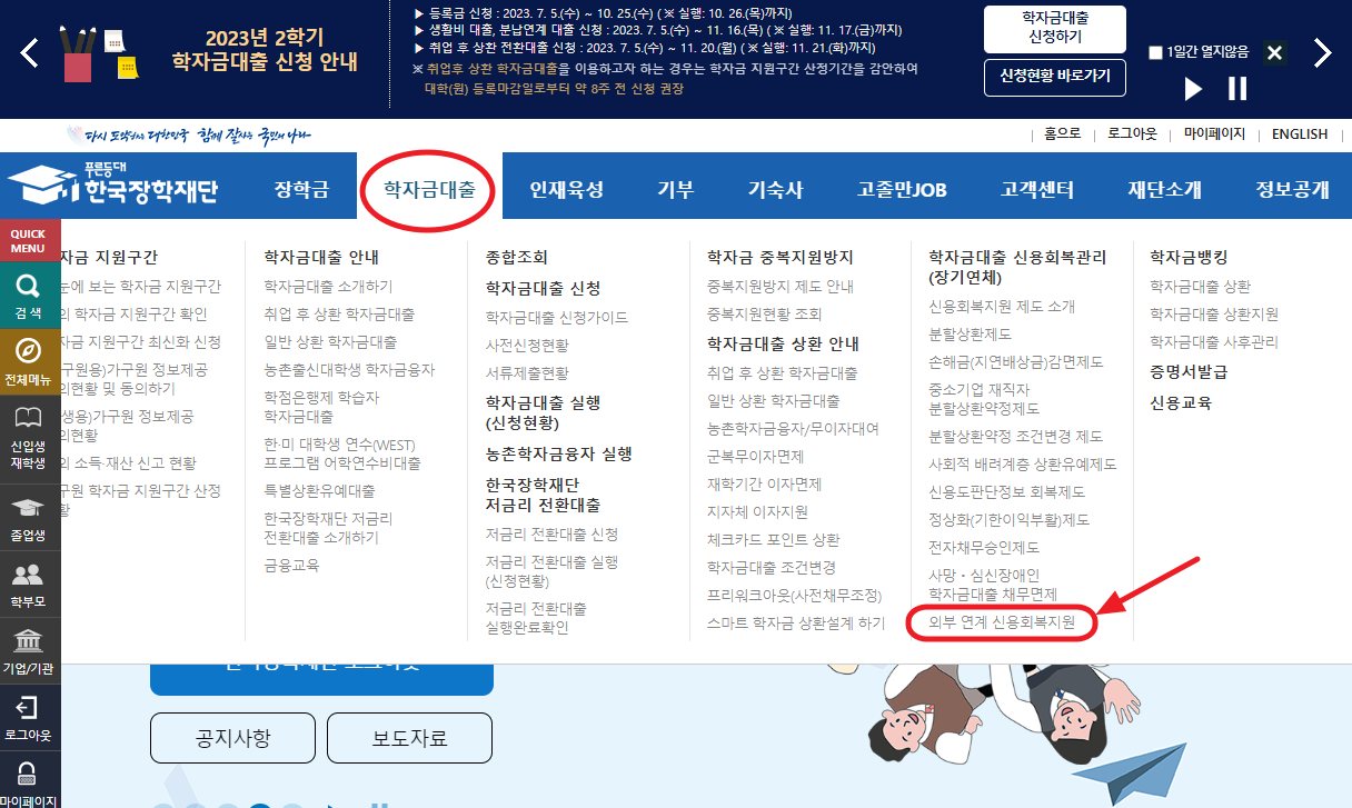 1. 홈페이지 접속 > 학자금대출 > 학자금대출 신용회복관리 > 외부 연계 신용회복지원제도