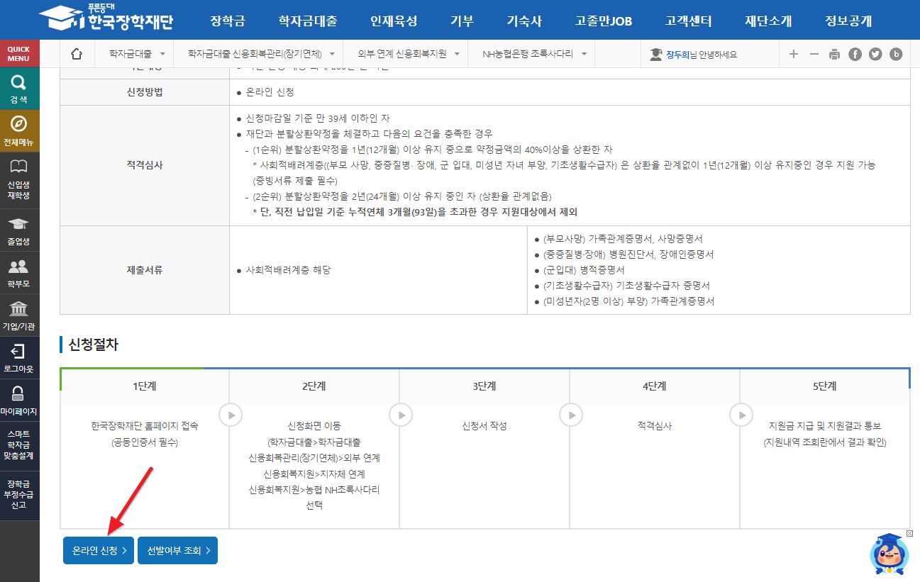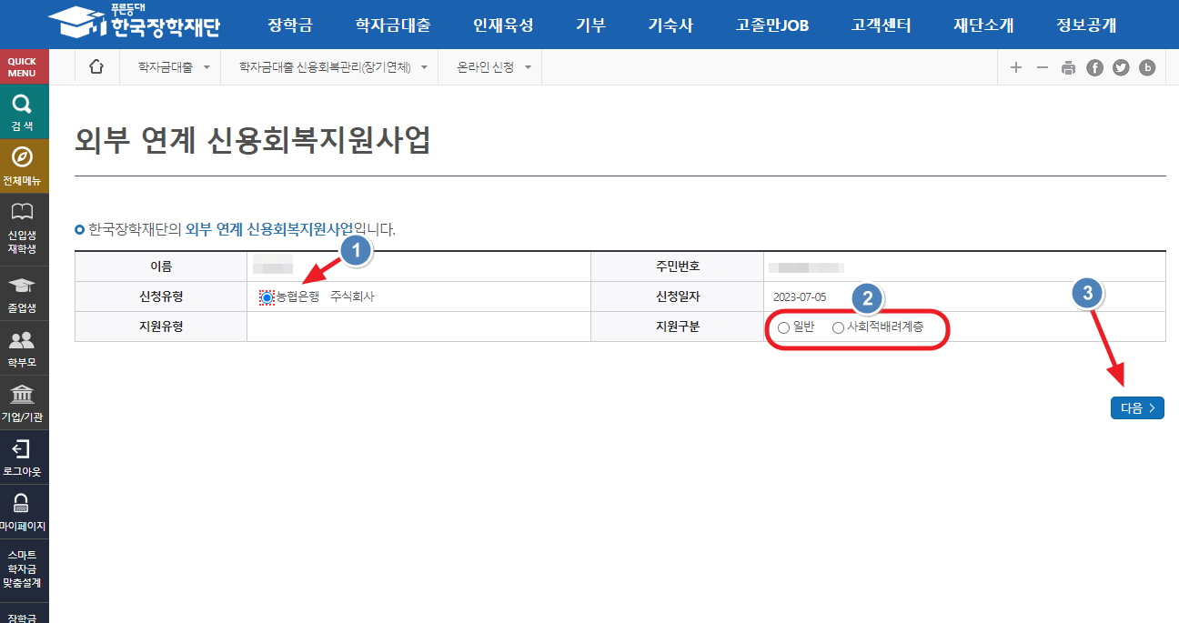 3. 학자금대출 신용회복관리 > 외부 연계 신용회복지원> NH농협은행 초록사다리> 온라인신청 클릭