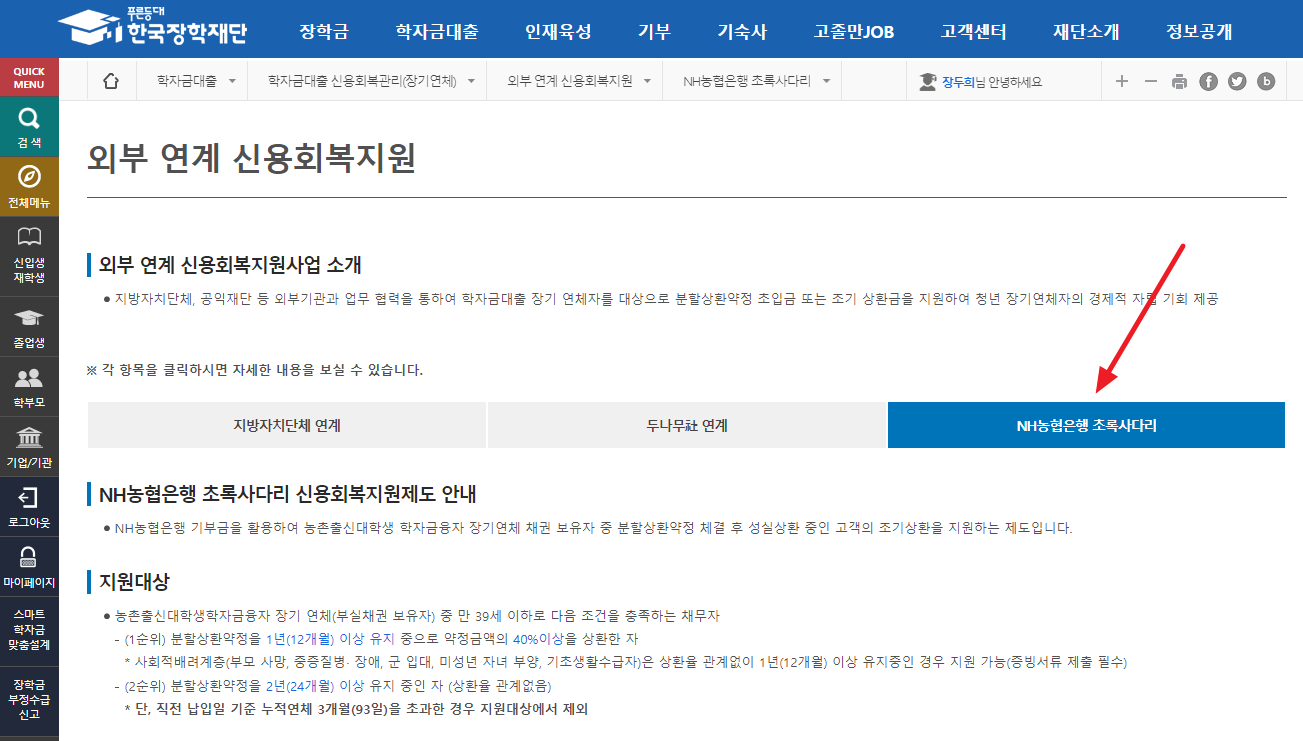 2. 학자금대출 > 학자금대출 신용회복관리 > 외부 연계 신용회복지원> NH농협은행 초록사다리 클릭
