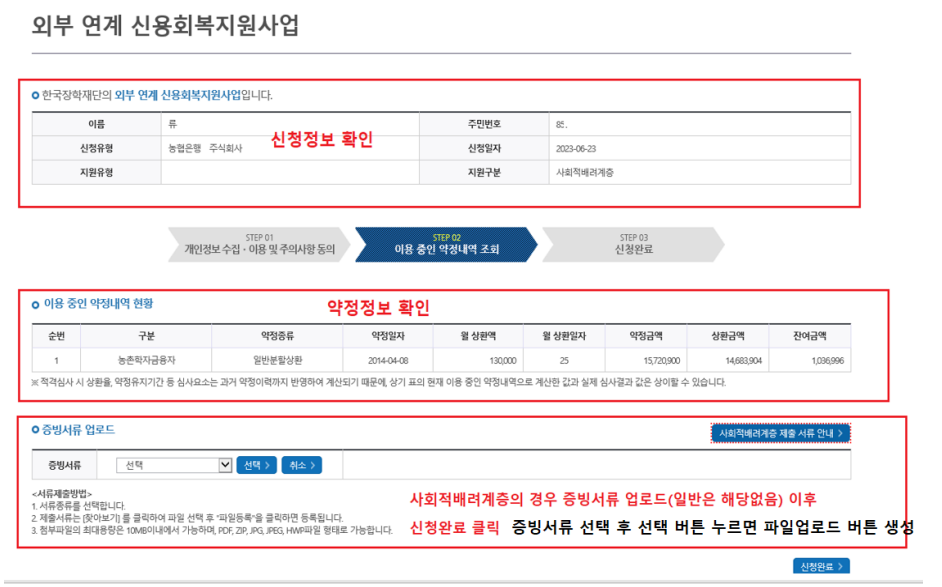 7. NH농협은행 초록사다리 > 온라인 신청 > 신청정보 및 약정정보 확인(지원구분: 사회적 배려계층)