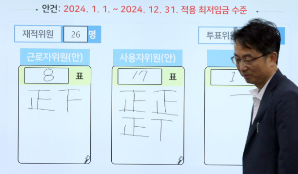 총 27명에서 근로자위원 1명(김준영 사무처장)을 제외한 26명이 이번 최저임금위원회 투표를 진행했는데요. 총 재적위원 26명에서 근로자위원의 최종요구안(1만원)은 8표를, 사용자위원의 최종요구안(9860원)은 17표 그리고 무효가 1표 나와서 사용자위원의 최종요구안인 9,860원이 24년도 최저임금으로 결정된 것입니다.