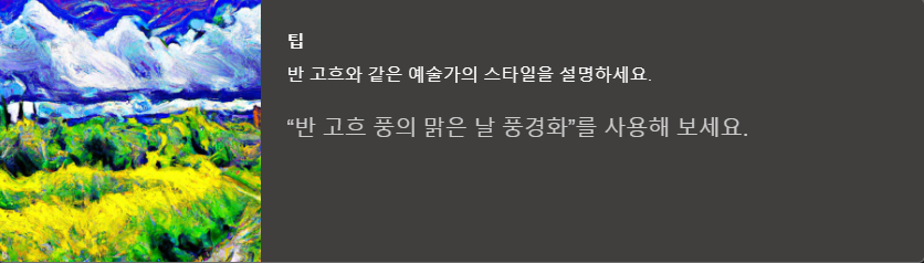 좋은 결과물을 얻기 위해서는, 영어로 '형용사+명사+동사+스타일' 식으로 만들면 됩니다.
