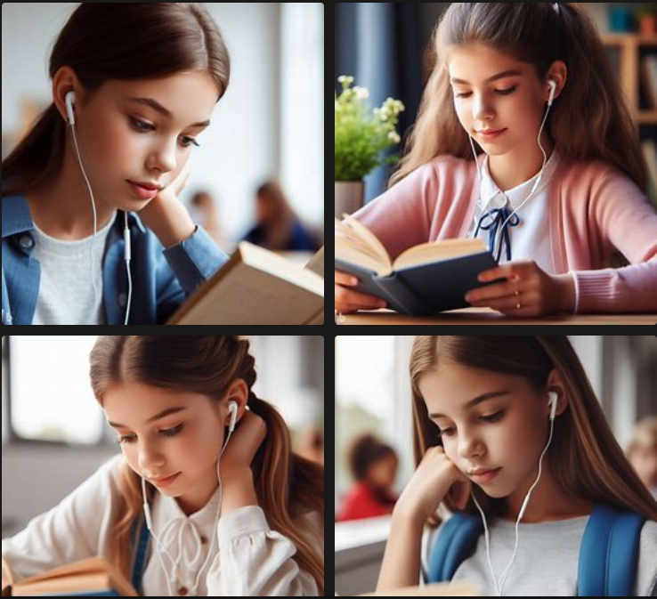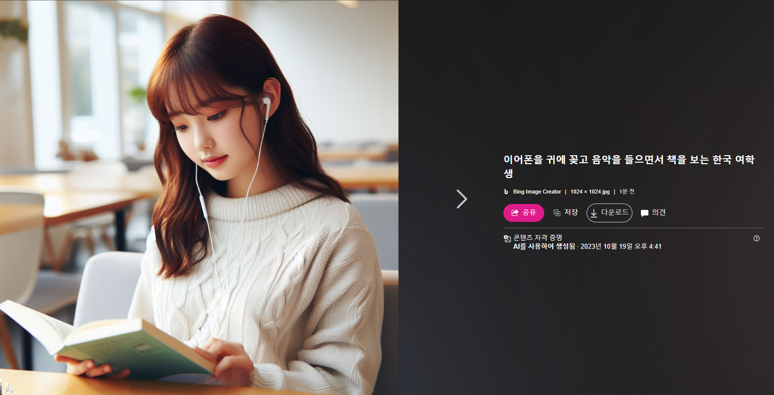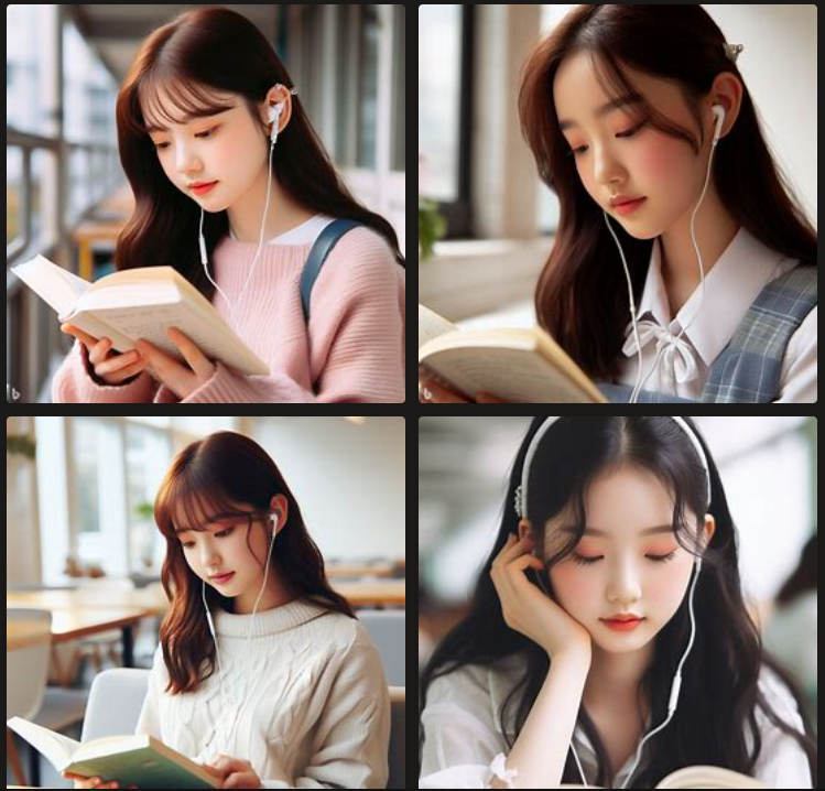 이번에는 '이어폰을 귀에 꽂고 음악을 들으면서 책을 보는 여학생'라고 입력해보았습니다.