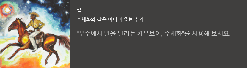 수채화와 같은 미디어를 추가할 수 있습니다. '우주에서 말을 달리는 카우보이, 수채화'같은 형식으로요.