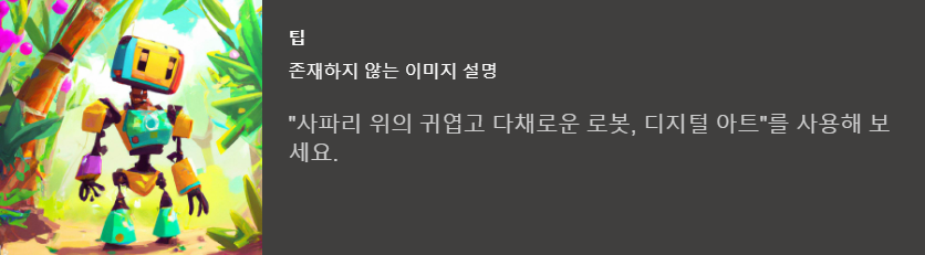 존재하지 않는 이미지를 설명할 때 아래처럼 '사파리 위의 귀엽고 다채로운 로봇, 디지털 아트'라고 치면 아래와 같은 그림이 생성됩니다.