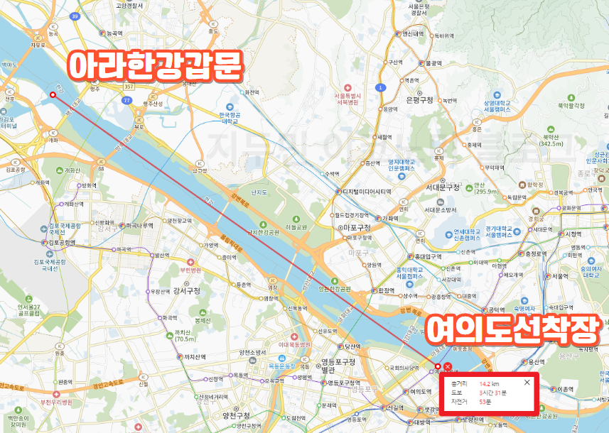 | 노선 | 아라한강갑문~여의도(광역) 마포·여의도·잠원·잠실 등(시내) |
