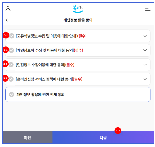 3-1. 개인정보 활용에 대한 내용을 확인 후 각각 동의를 하거나 전체동의를 누릅니다.