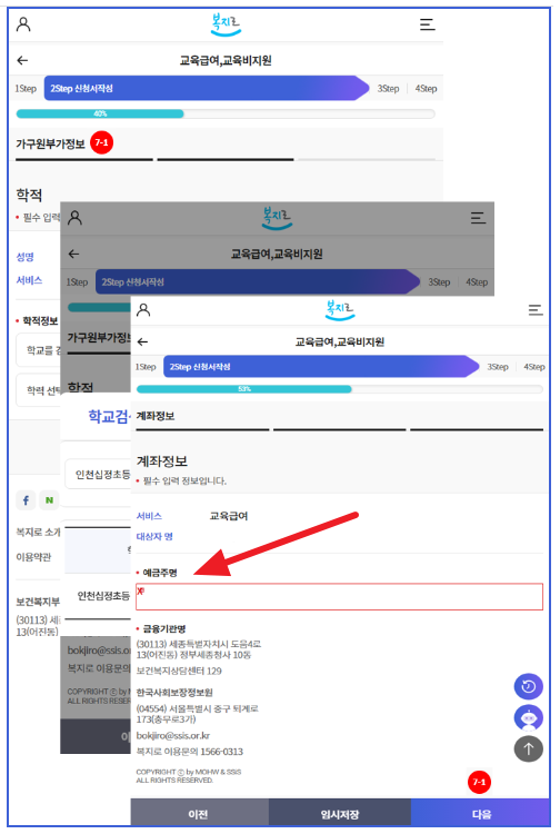 7-1. 가구원부가정보 및 계좌정보를 입력하고 '다음'을 누릅니다.