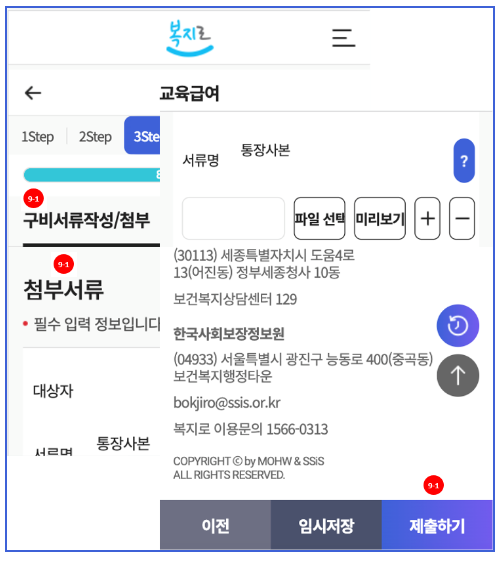 9-1. '구비서류 작성/첨부'에서 첨부서류를 업로드 후 '제출하기'를 누릅니다.